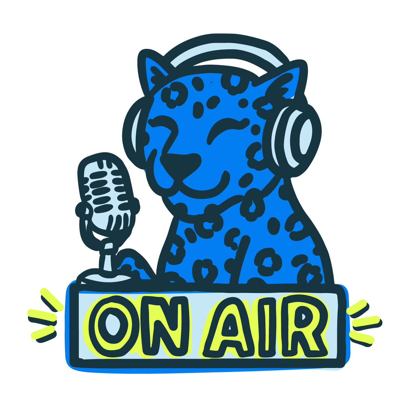 Illustration of a cheetah wearing headphones, holding a microphone, with a sign that says 'ON AIR' in bright yellow and black letters.