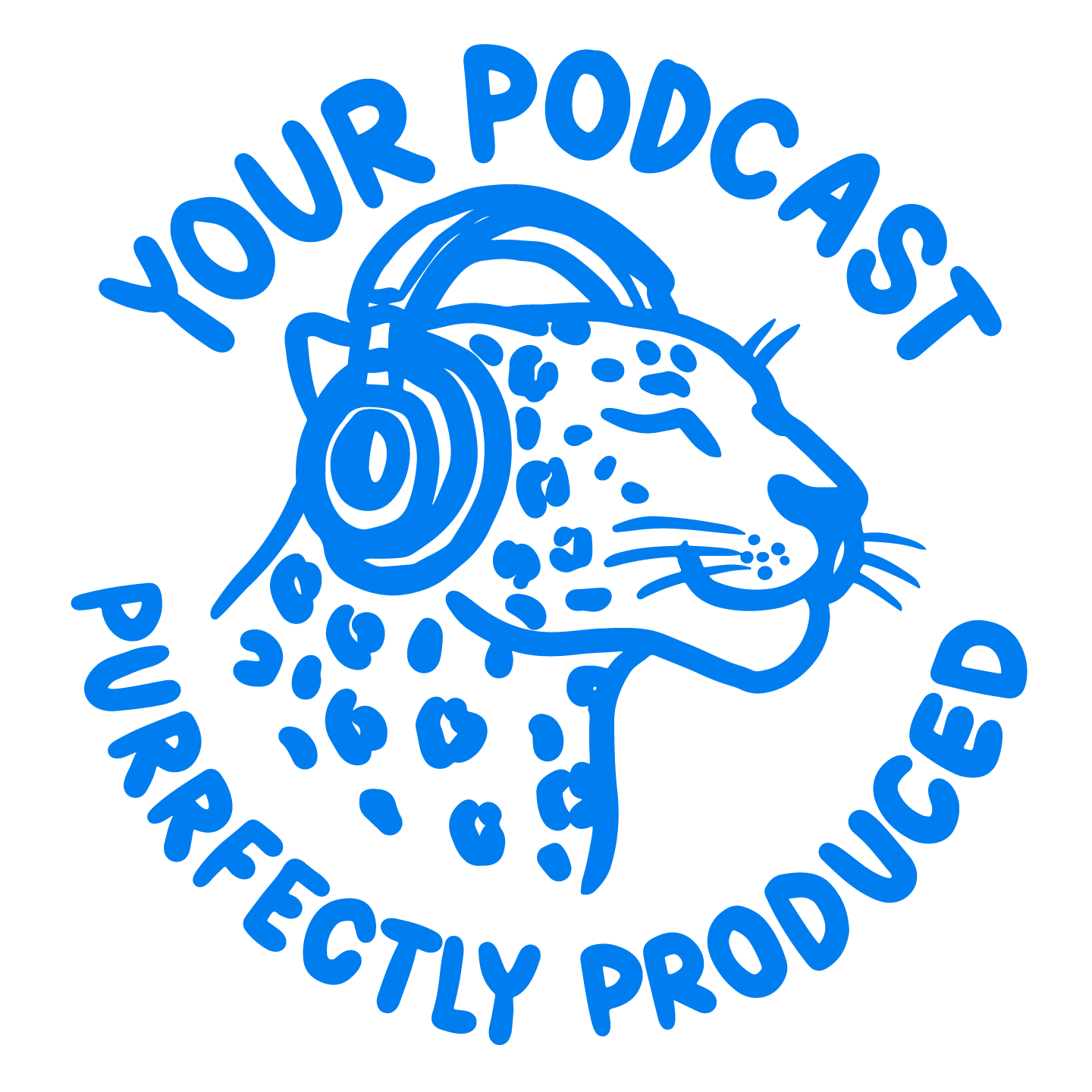 Blue logo with a detailed illustration of a leopard wearing headphones, framed by the text 'Your Podcast Surprisingly Produced' in a circular arrangement.